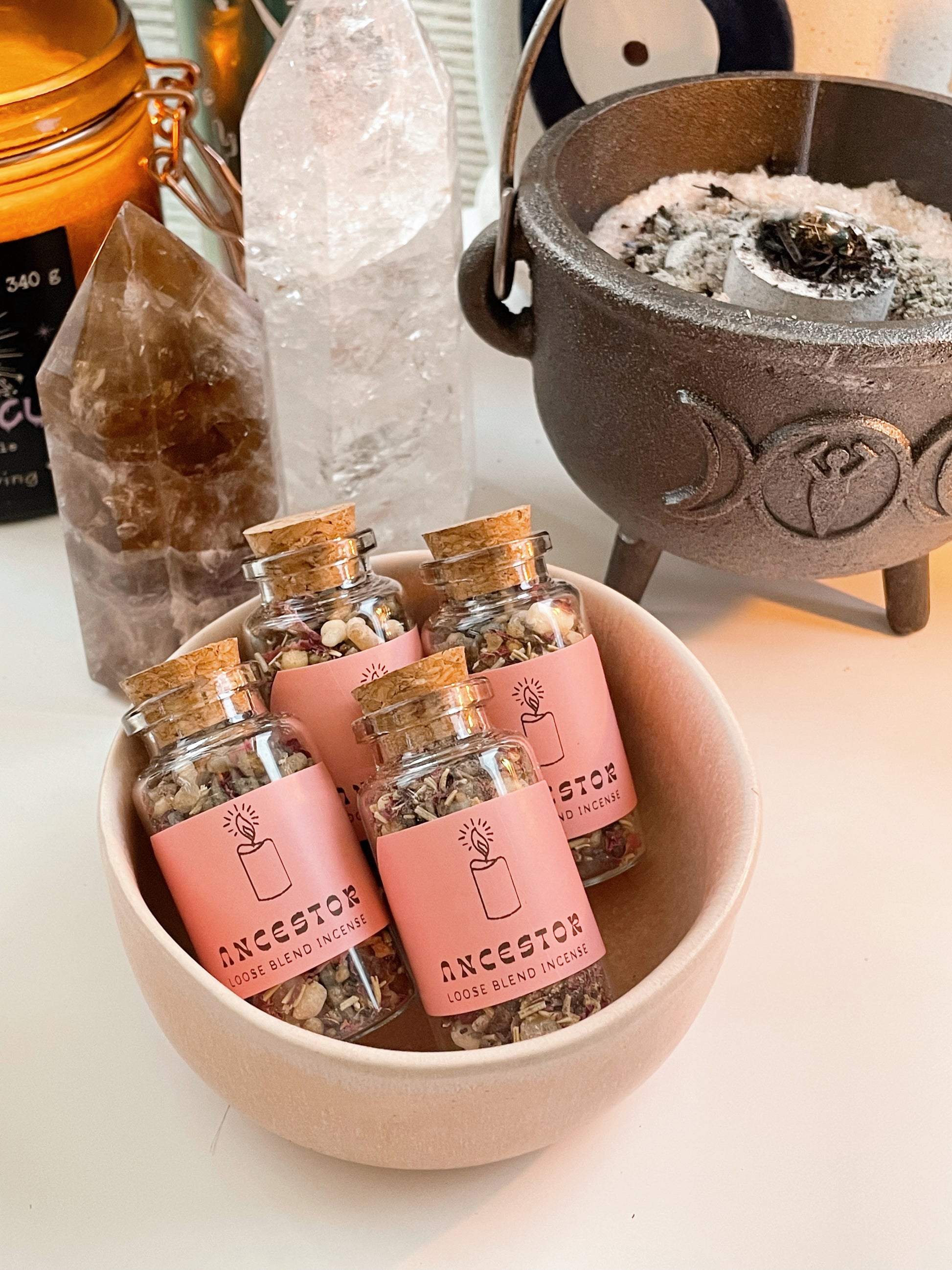 Handcrafted loose blend incense created with a variety of herbs and resins. This makes a beautiful incense to use as an offering in ancestral work and as part of your daily/weekly practice with your ancestors.