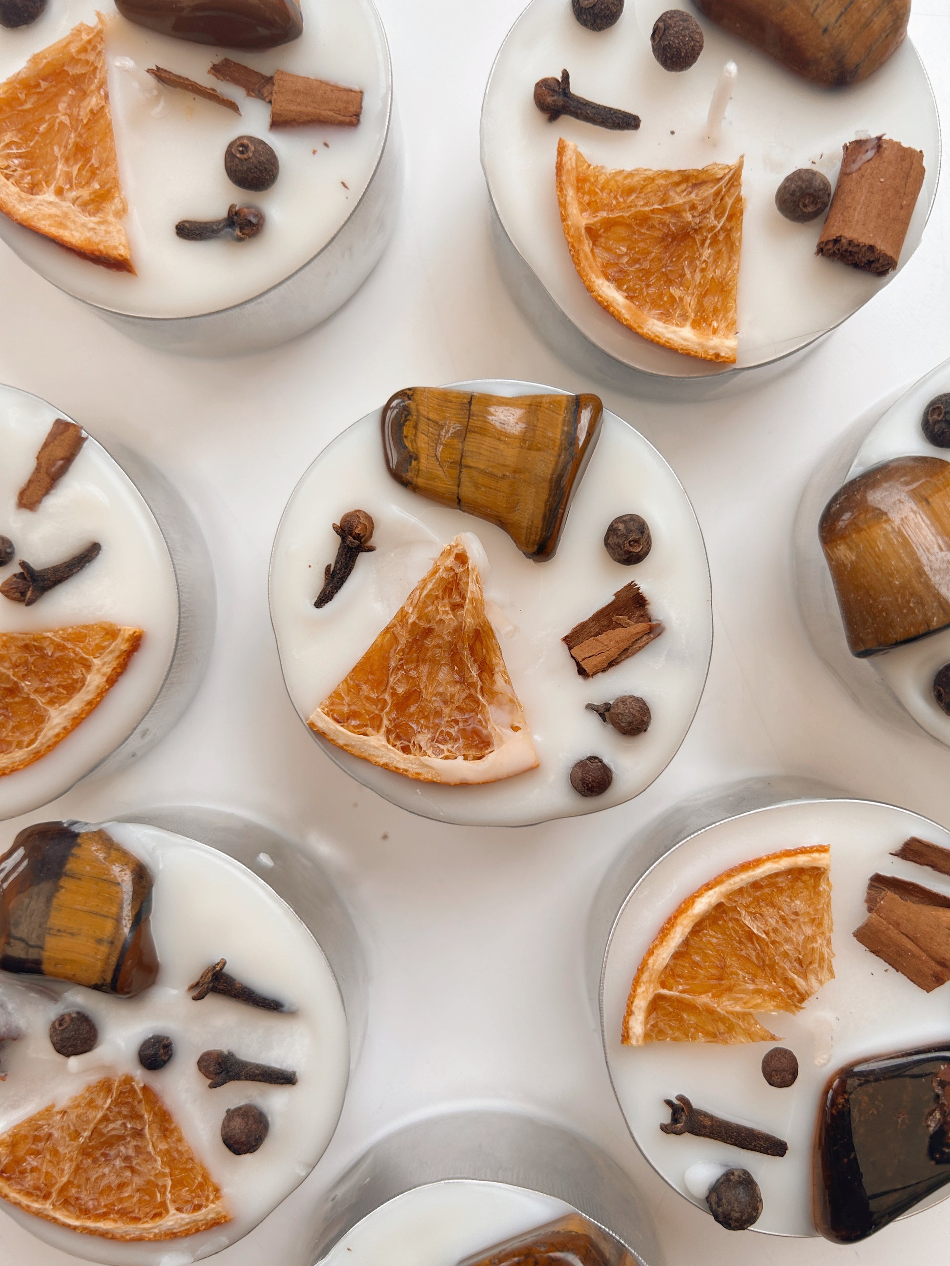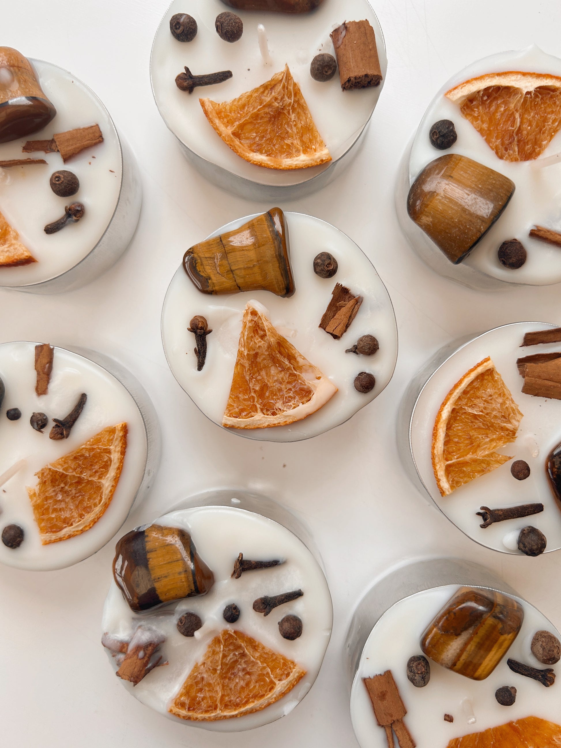 Invite abundance and prosperity into your home this season with our Autumn Abundance spelled tealight candle. Topped with a tigers eye crystal, orange, cinnamon, cloves and allspice, with a light pumpkin spice scent.