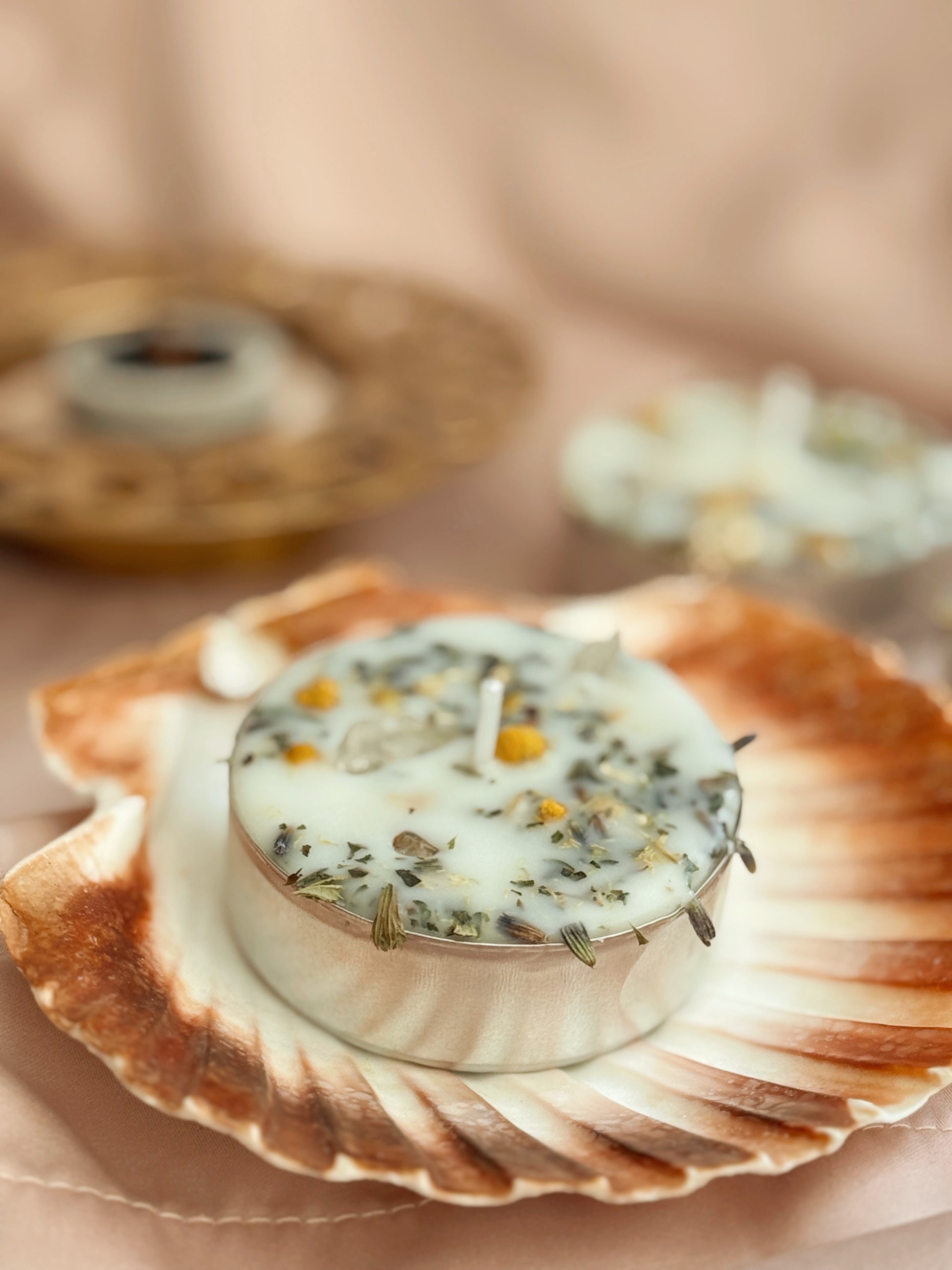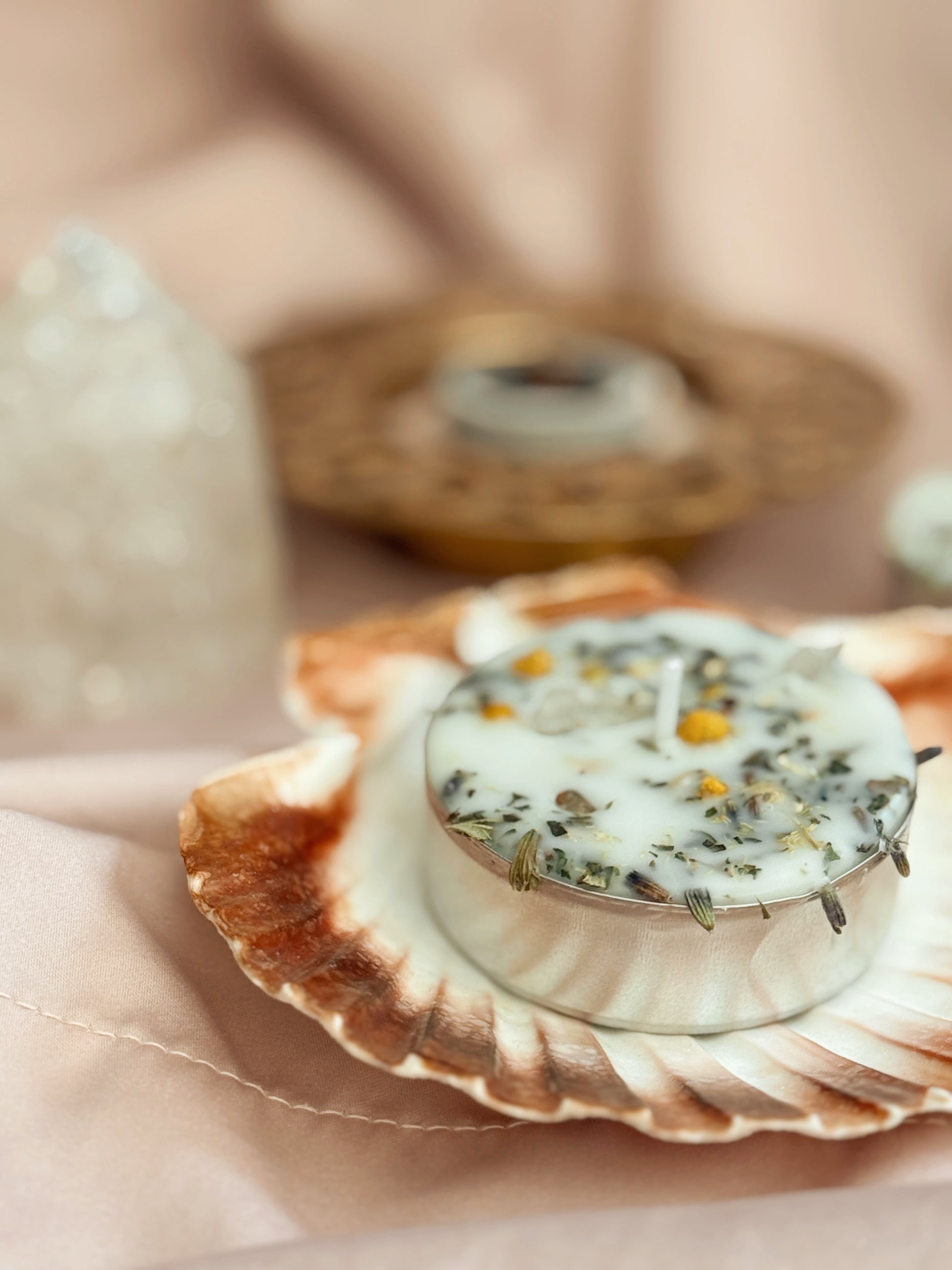 Soothe your spirit and invite gentle restoration with this calming tealight. Dressed with lemon balm, lavender, chamomile, and clear quartz crystal chips, it's crafted to support emotional healing, peace, and energetic renewal - perfect for self-care rituals and recovery spells.