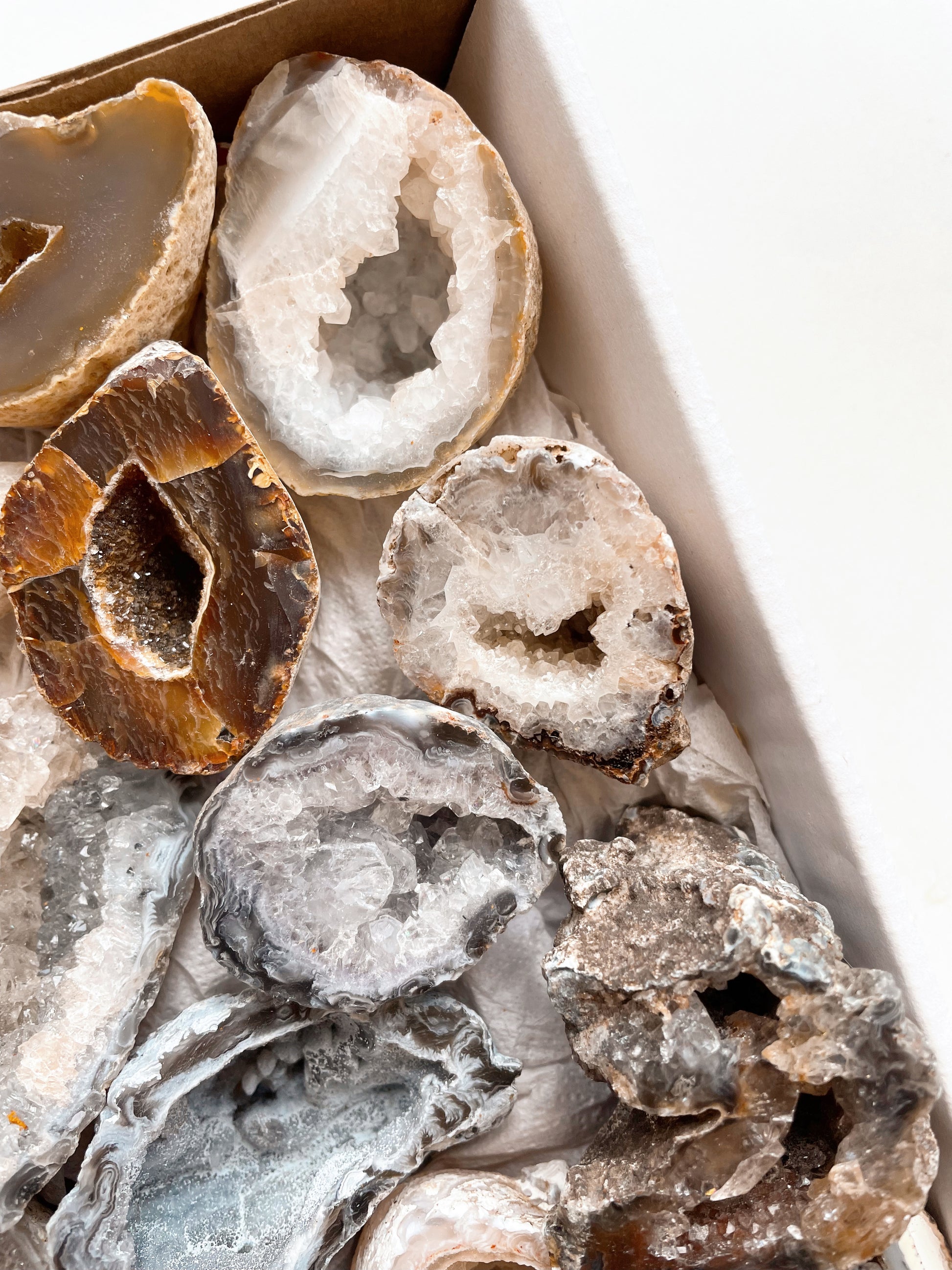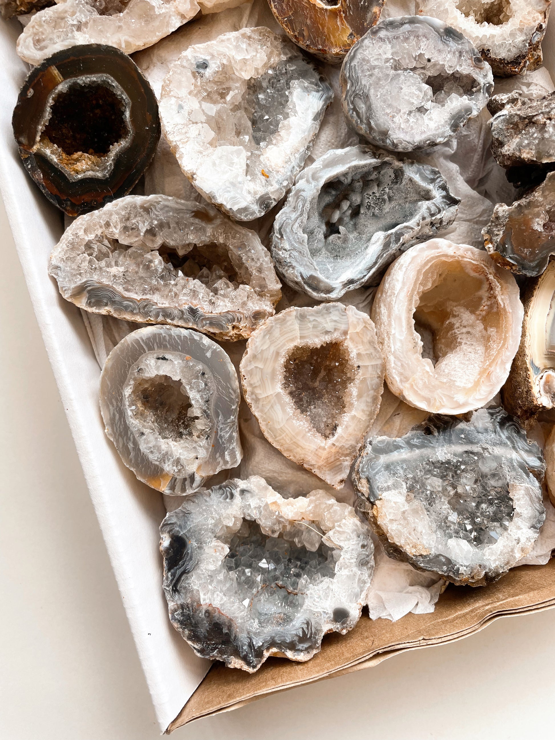 Agate A : Measures approximately 7cm x 3cm, stunning druzy opening with darker grey banding.