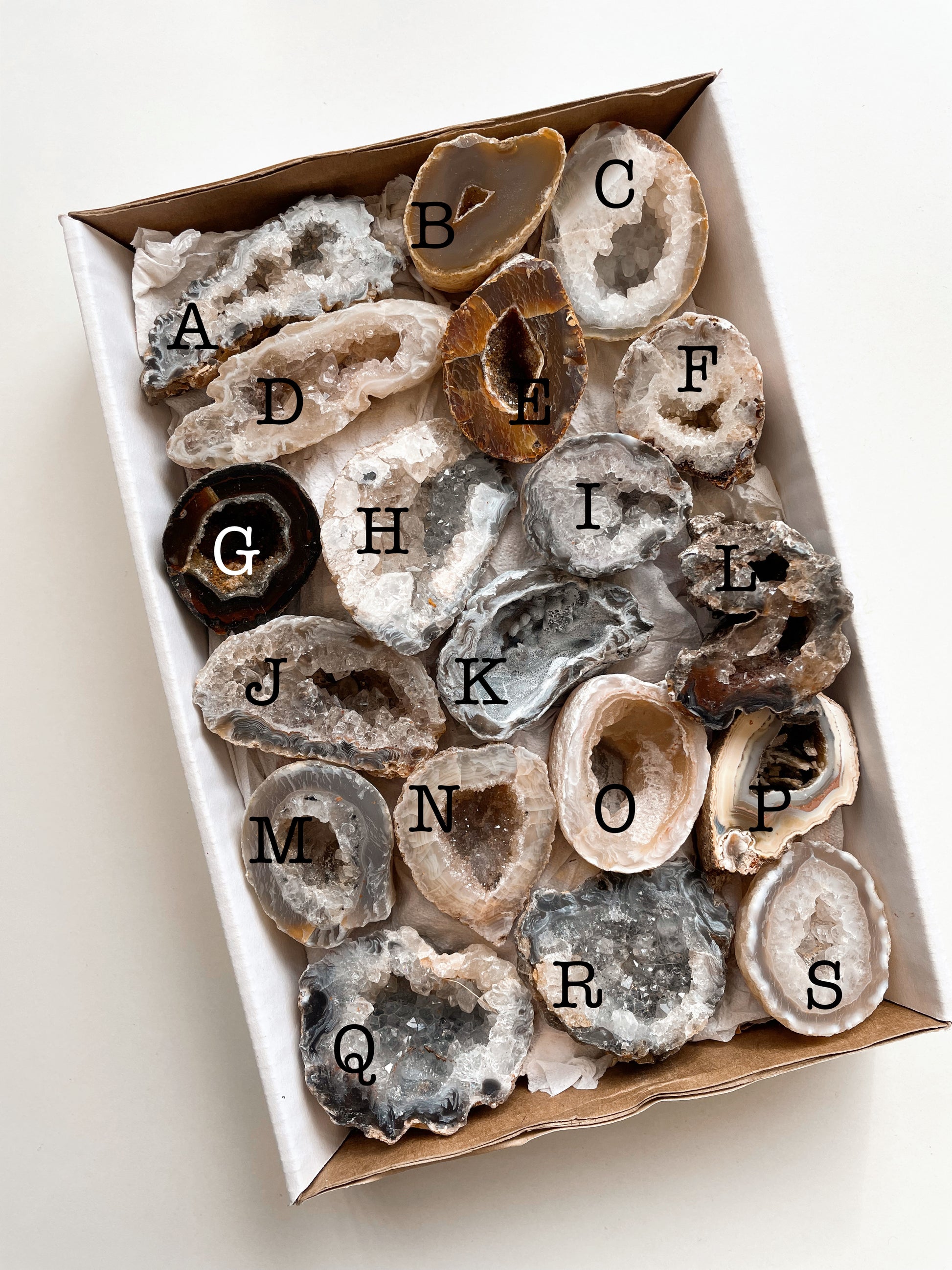 Agate O : Measures approximately 5cm x 4cm x 3cm, a cream half geode with a large cave.