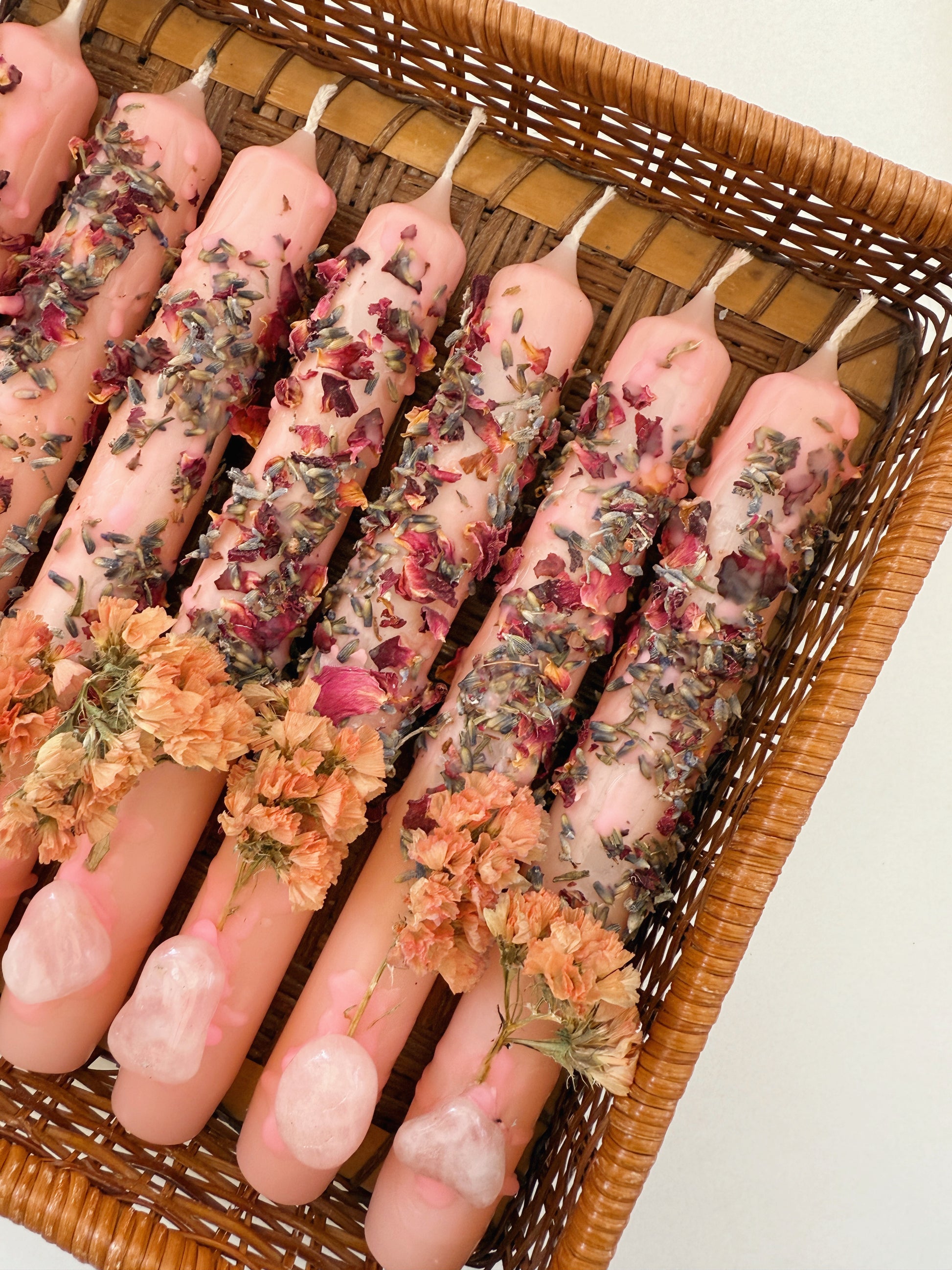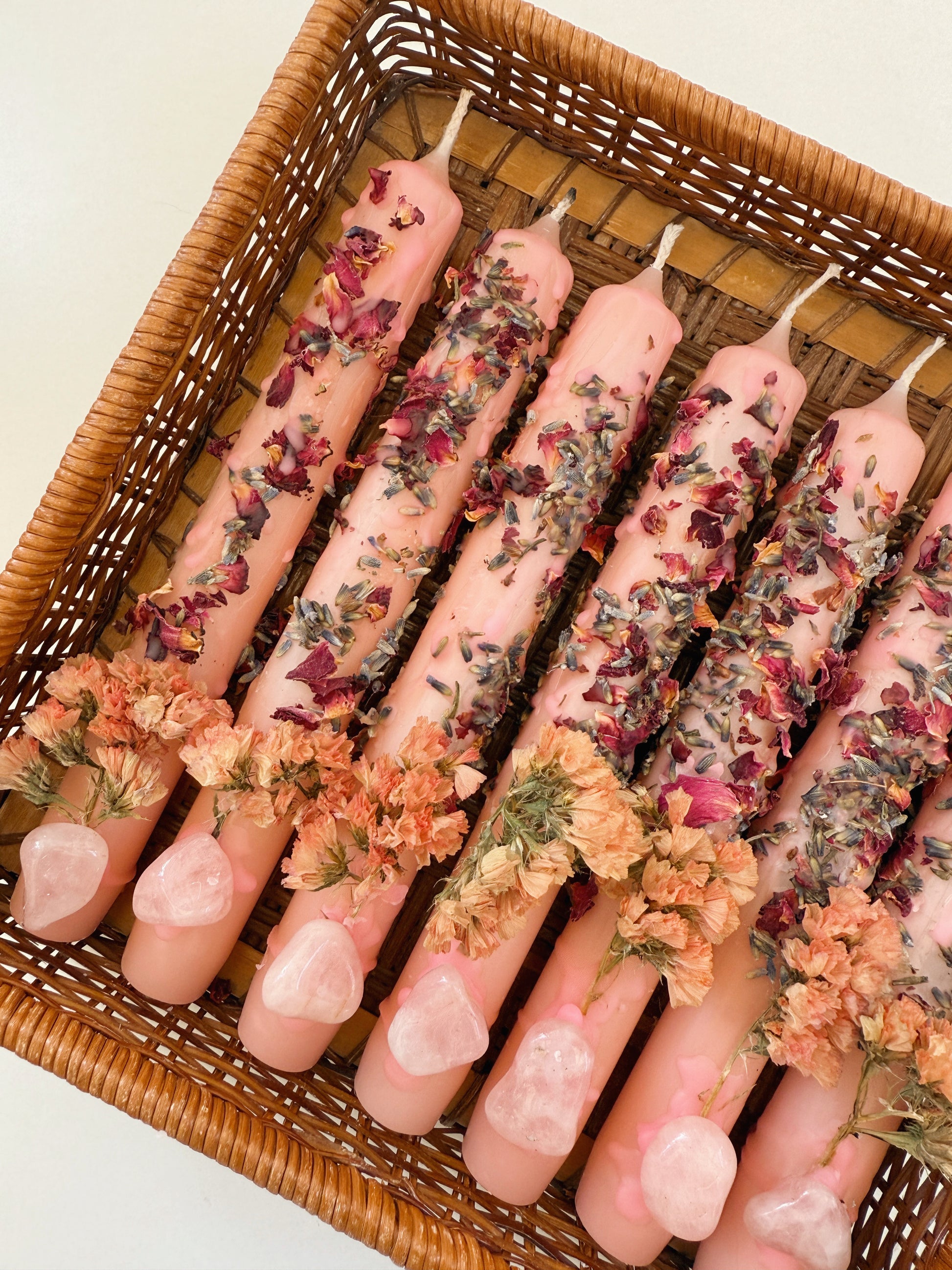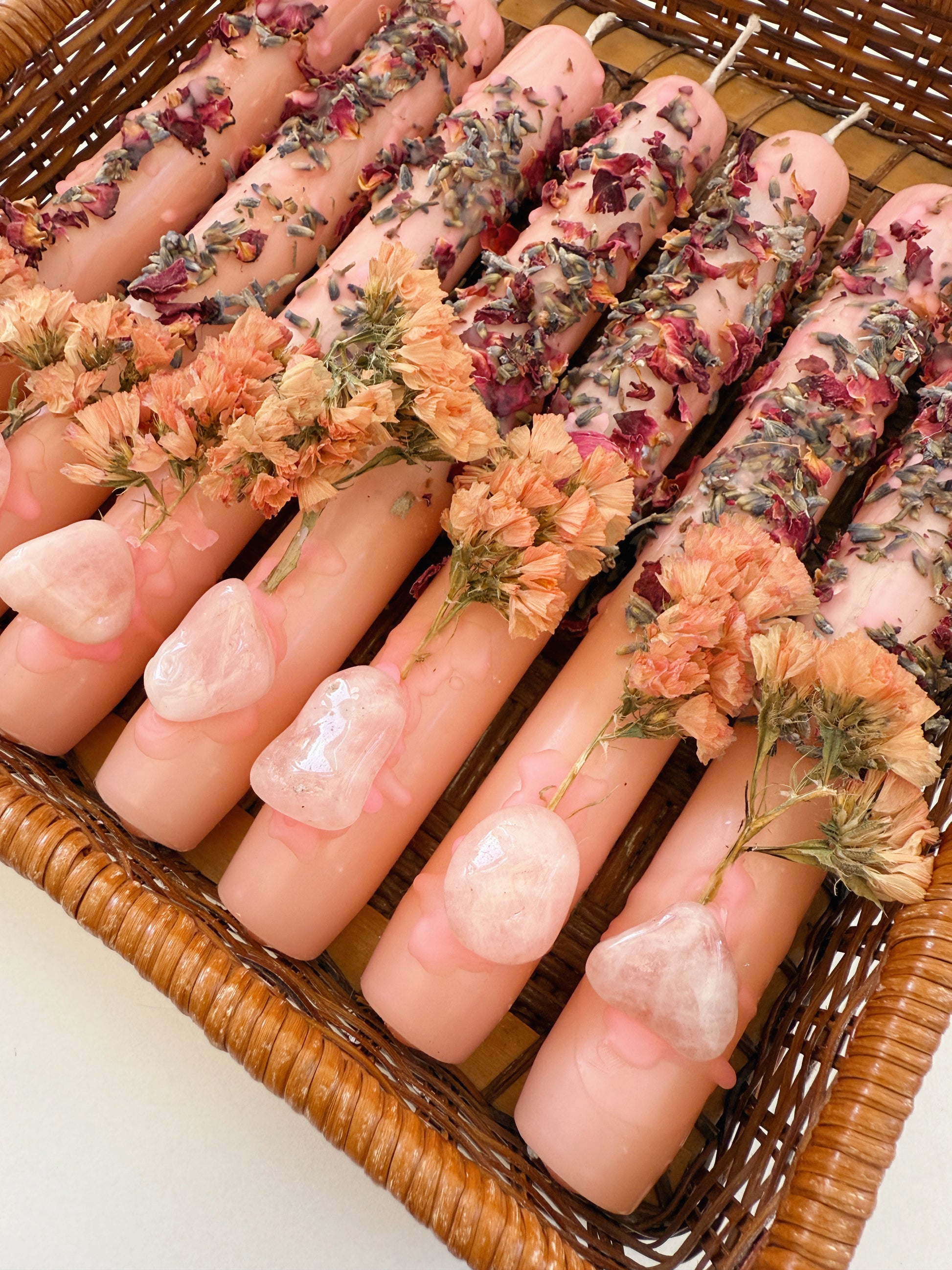 Dressed with rose, lavender, dried statice flowers and a small Rose Quartz crystal. Please take care with burning; the herbs may make the candle burn at a higher level than a standard candle, so please burn on a firesafe surface. Remove the statice and crystal before the candle burns all the way down, and never leave your candle unattended.
