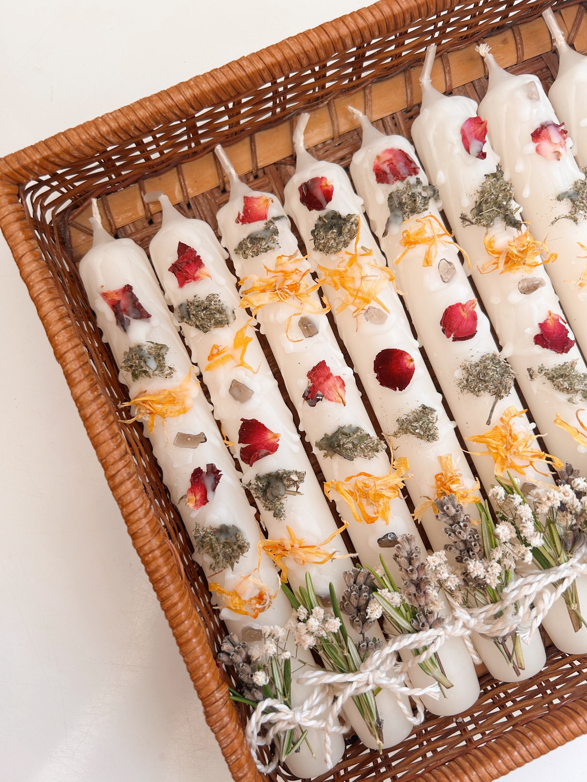 Dressed with calendula, rose, mugwort and smokey quartz chips, with a bundle of rosemary, lavender and gypsophila.