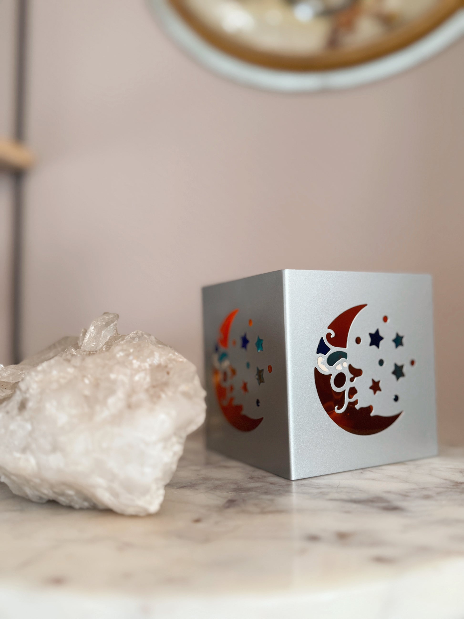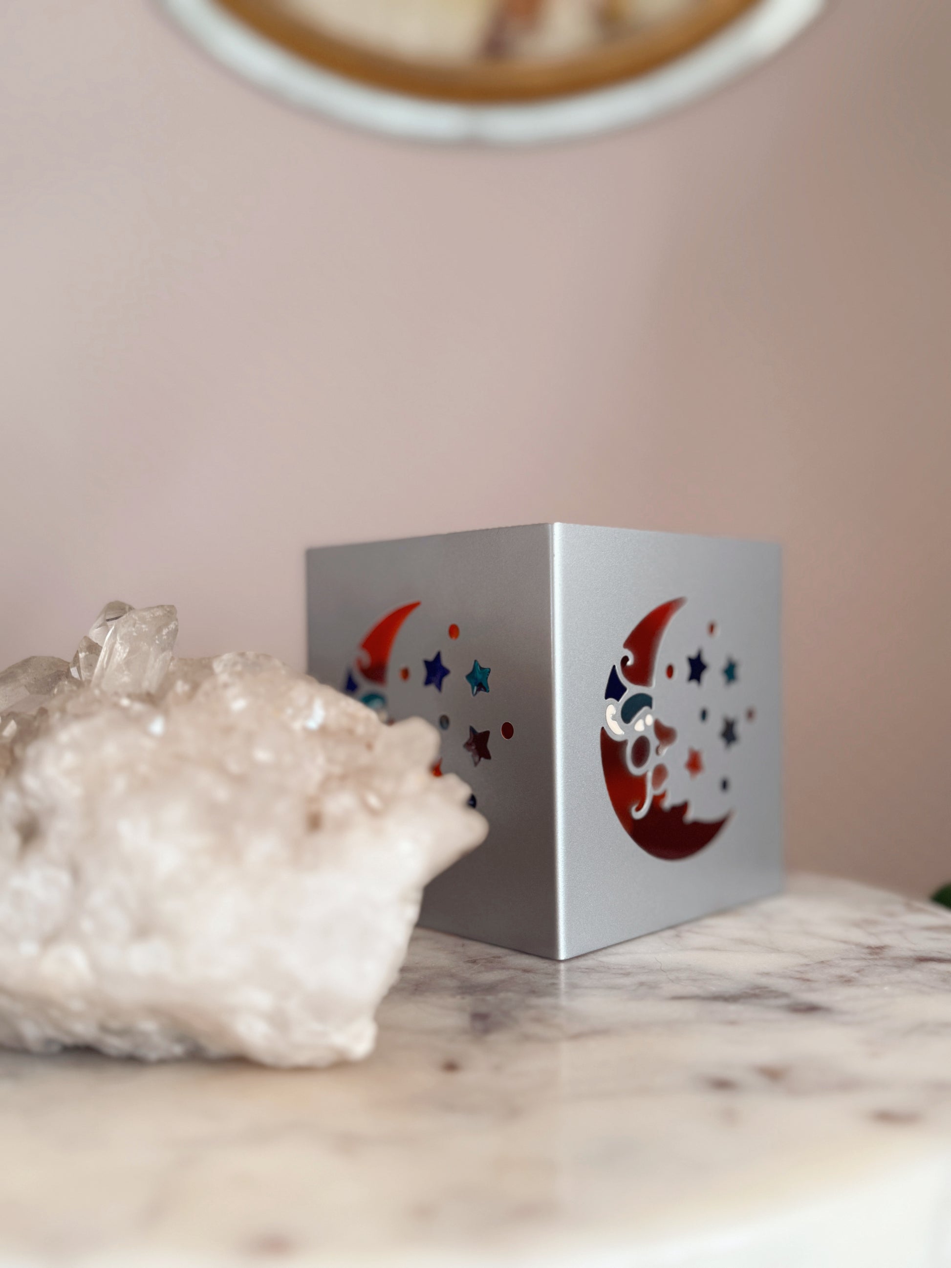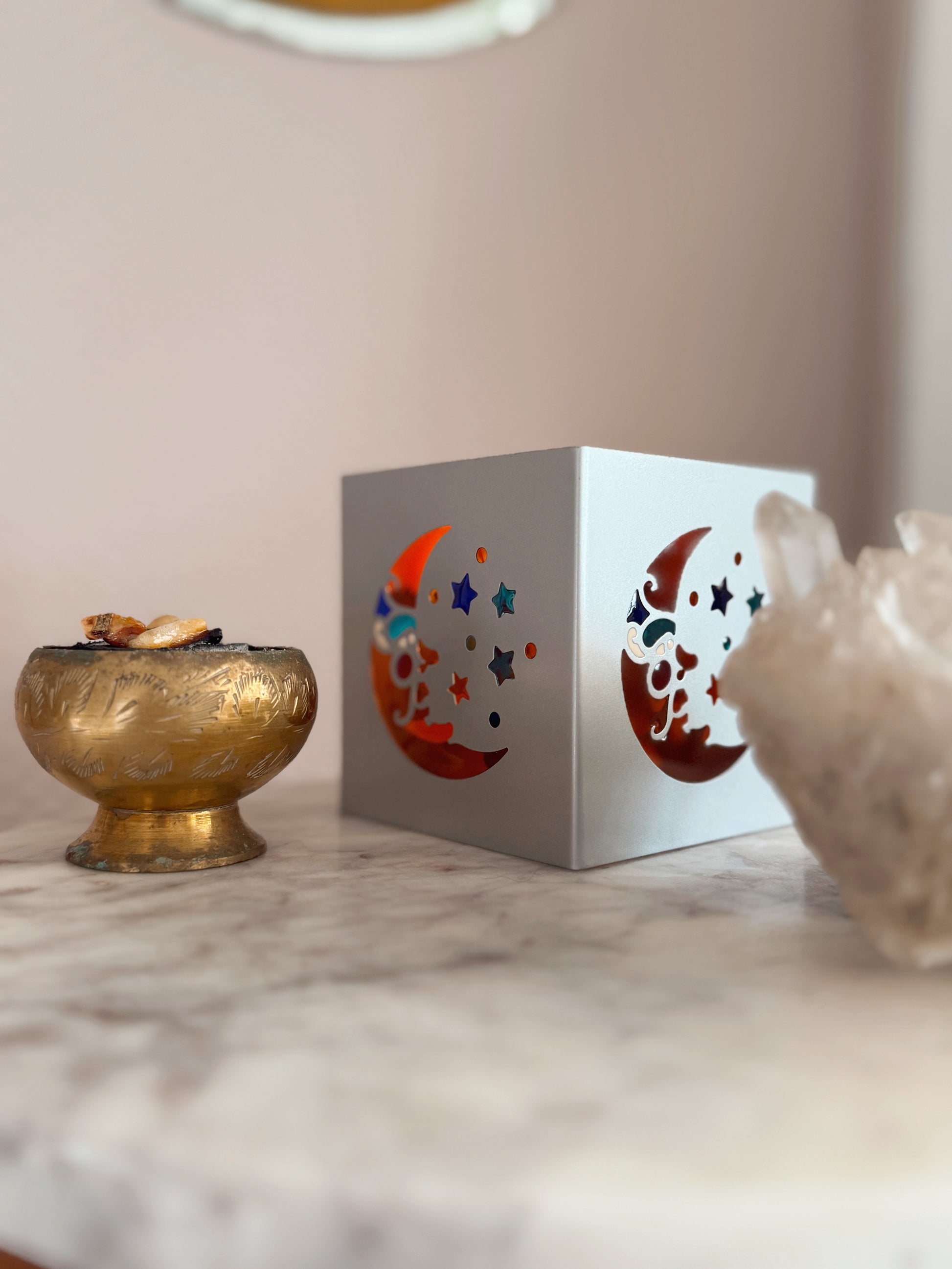 Super cute vintage cube tealight holder, with a cut out moon and star design to each side in orange, blue and red.