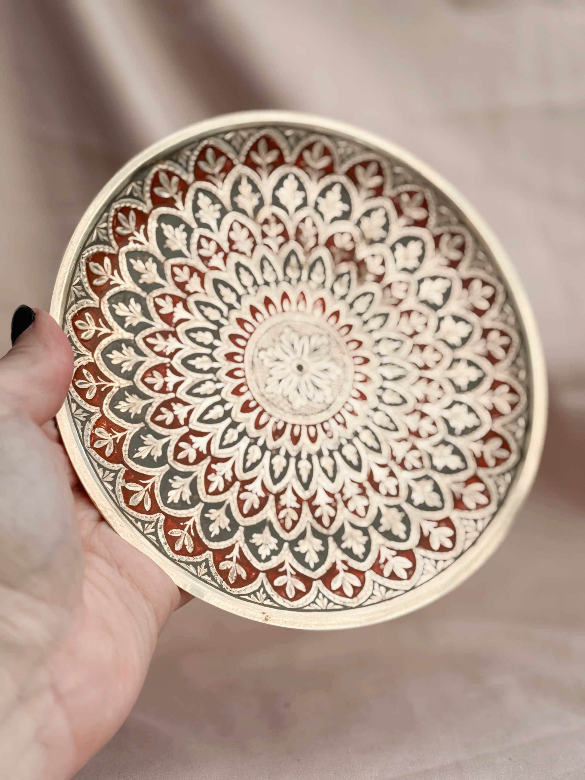 Stunning vintage brass plate, with an enamelled leaf and floral design to the base in sage green/grey and red. Beautiful piece to use for candle magic and spell work, or to display some of your favourite crystals on!