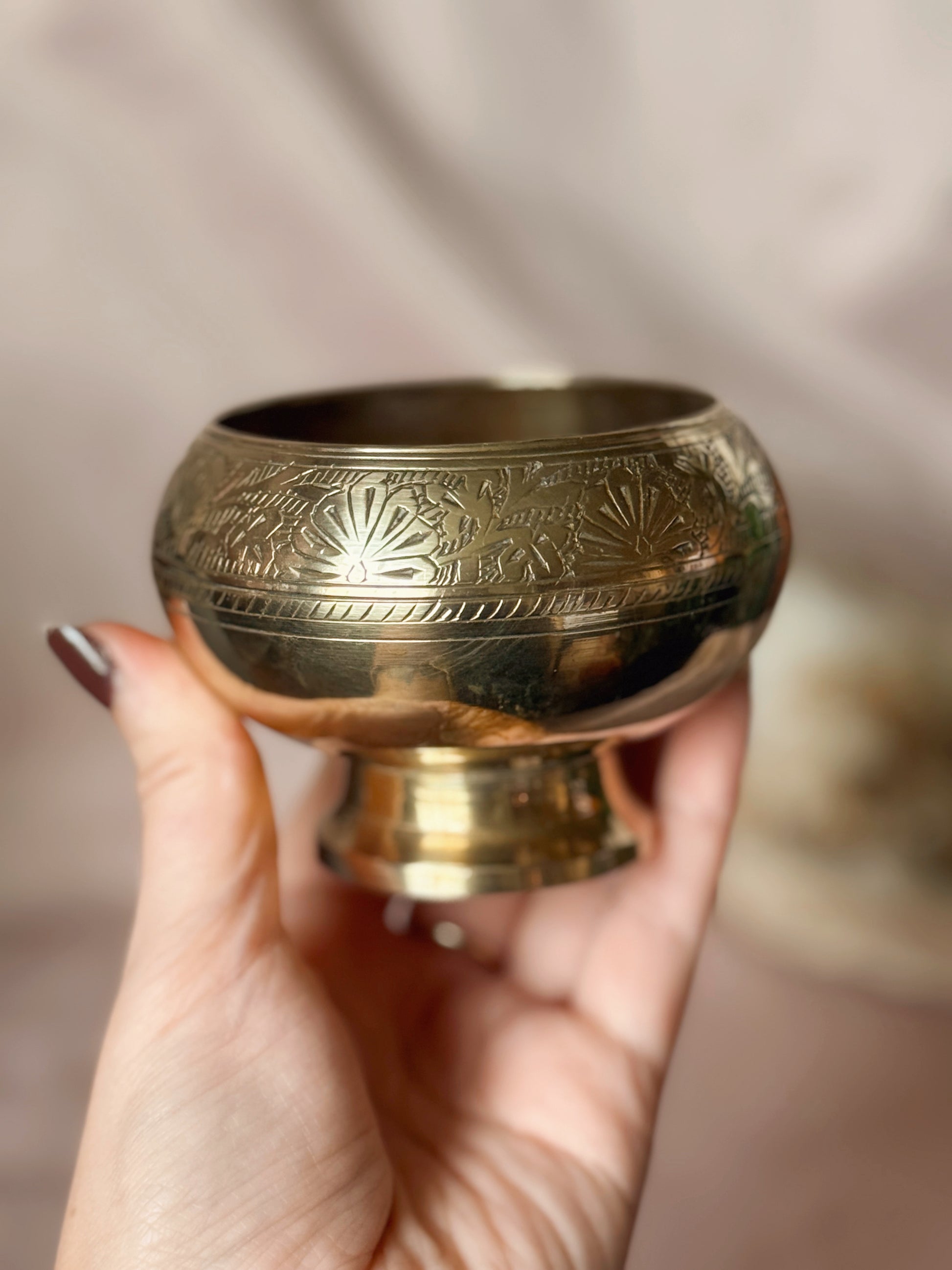 Beautiful vintage brass pot, sitting on a pedestal base with a floral engraved design around the top. Wonderful piece to burn incense inside!