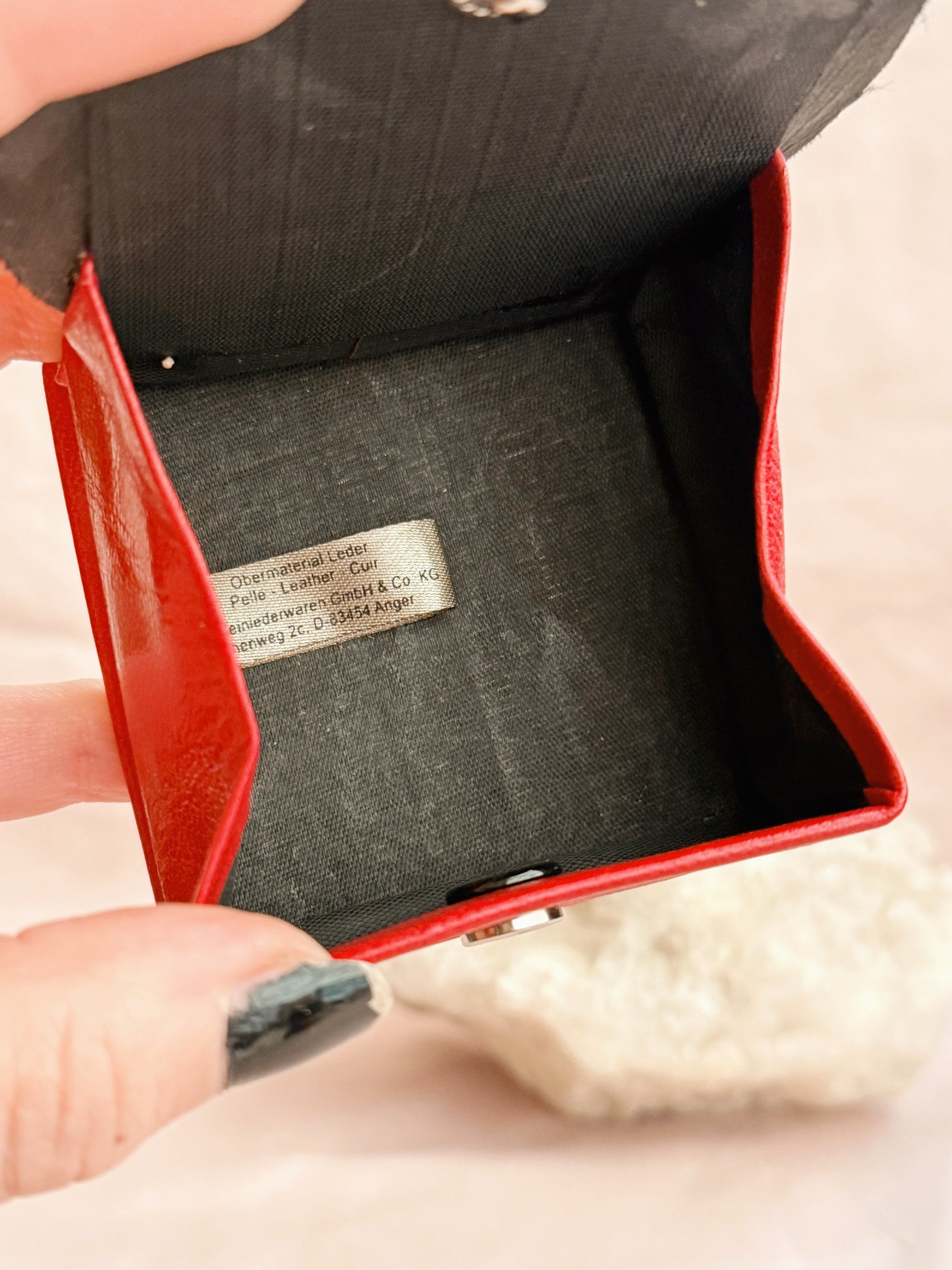 Adorable vintage leather folding coin purse, with a sun face design to the front.